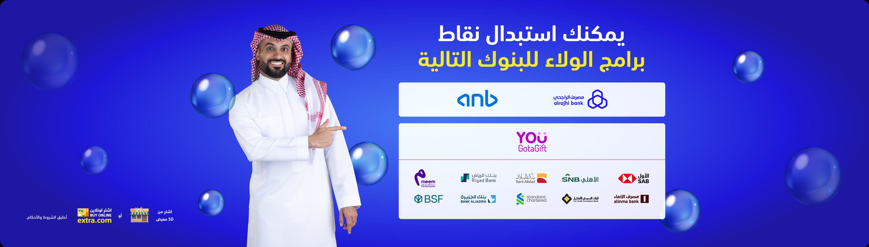 استبدال نقاط برنامج الولاء (مكافأة) من مصرف الراجحي صالح للاستخدام في جميع معارض اكسترا وموقعها الإلكتروني داخل المملكة العربية السعودية.