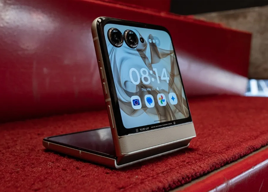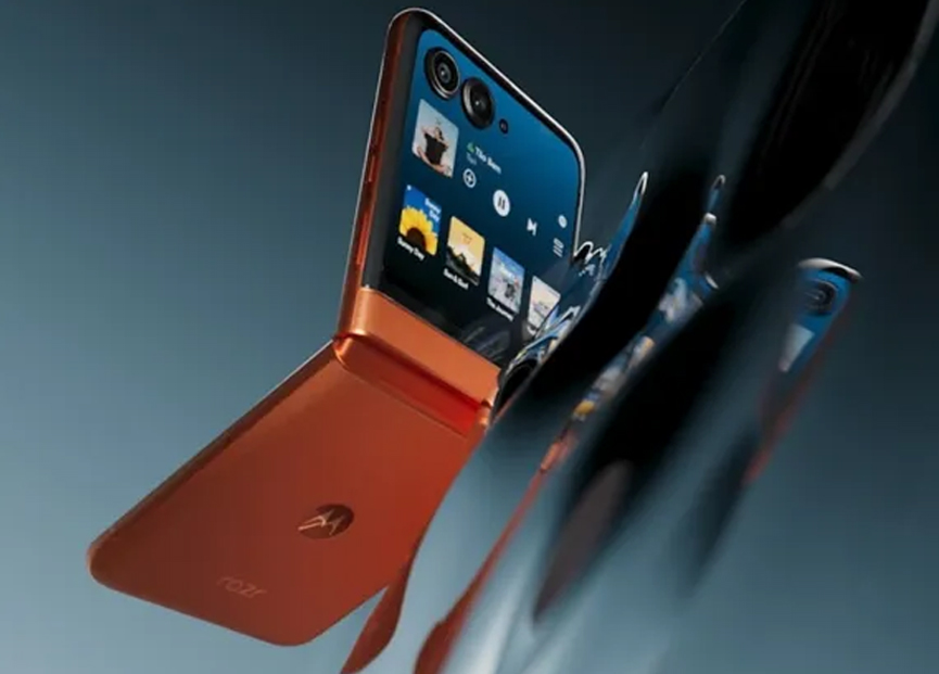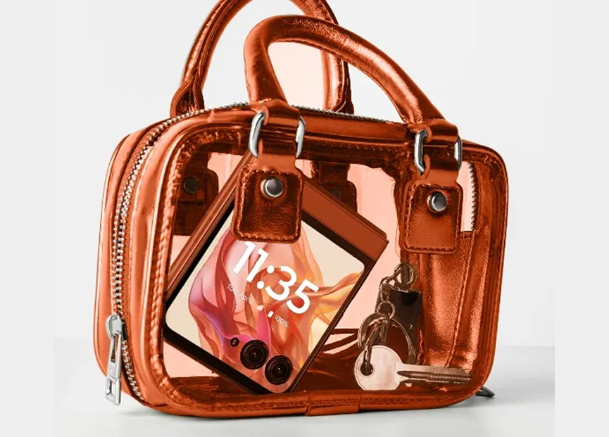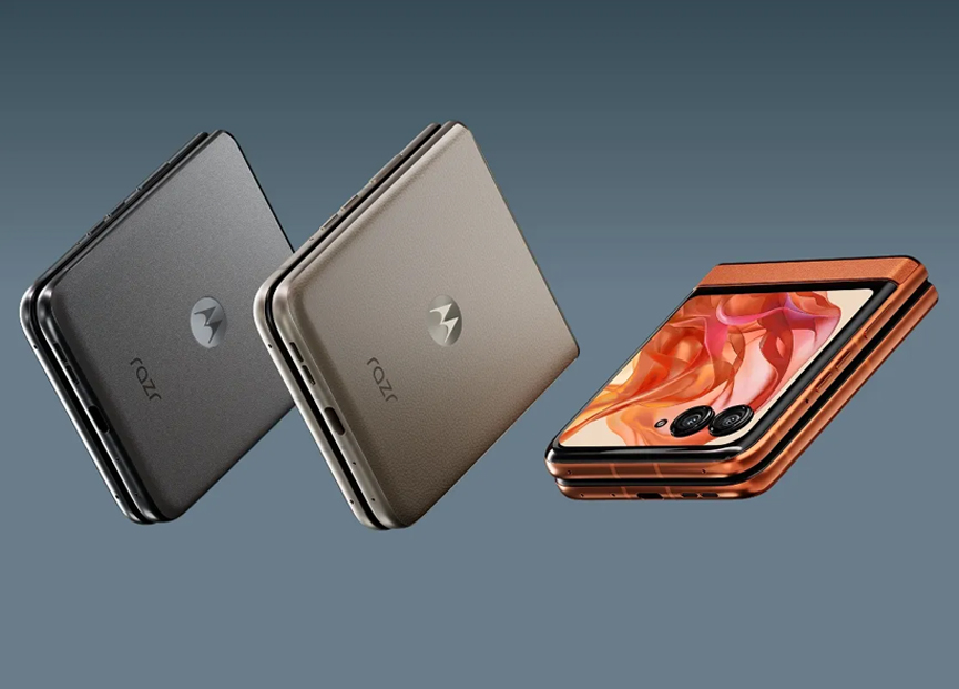 The more compact, comfortable, and creaseless new design of the motorola razr 50 is the perfect fit for your pocket. Choose a vegan suede finish in Koala Grey-or a vegan leather finish in Beach Sand or Spritz Orange-for a soft, tactile feel with an added touch of luxury.
