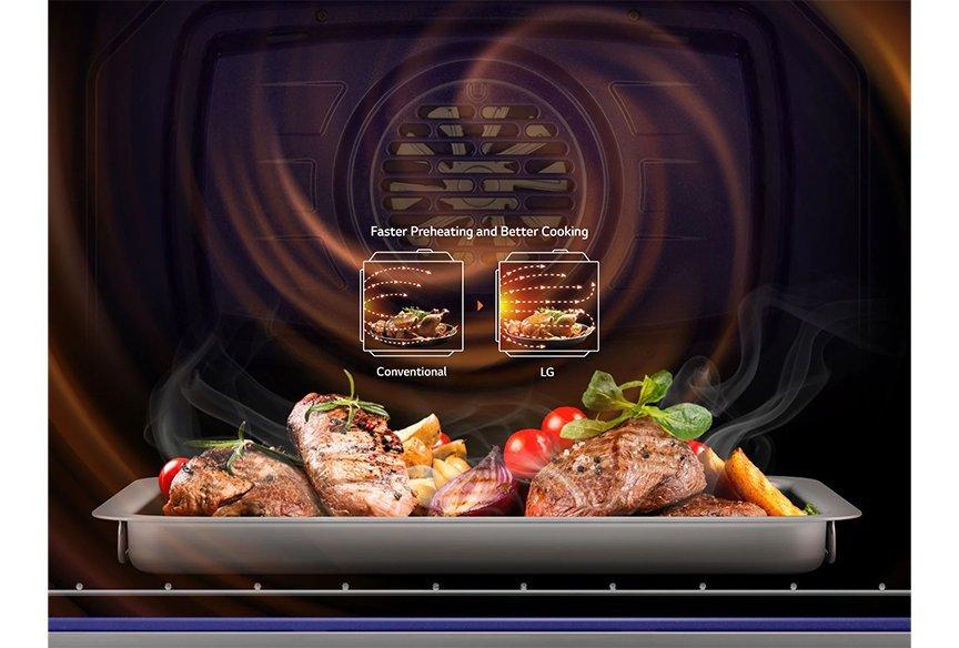 With extra heating element around the fan. LG True Convection system cooks more quickly, evenly, and efficiently than it would in a conventional oven. It also distributes heat and optimizes heating algorithm, flow rate and velocity. Discover faster preheating and better cooking.