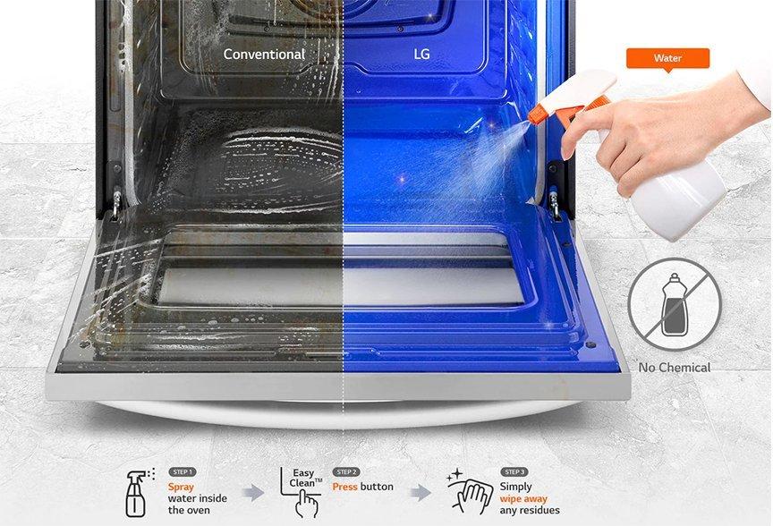 With a hydrophilic enamel coating you can easily remove any residue with nothing but water. Just wipe away any residue after spraying water inside the oven and push the EasyClean™ button to activate 20 minutes. "LG gas oven ranges are the easiest ovens to clean"